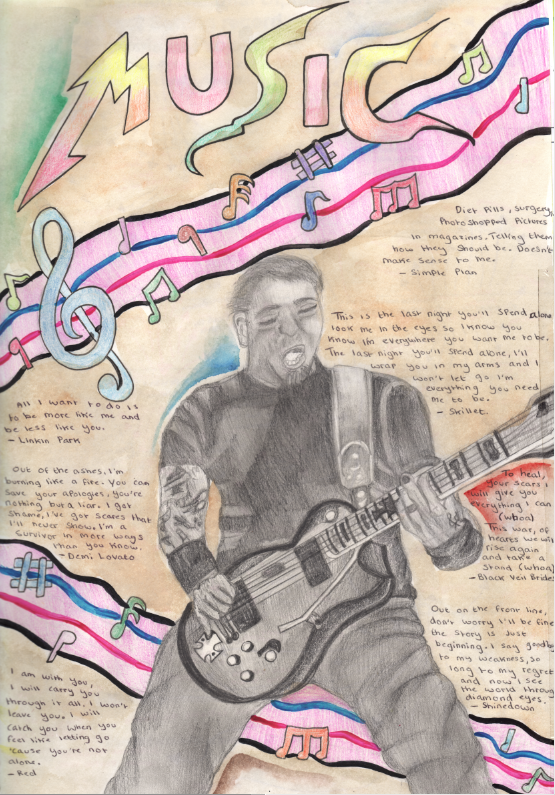 This is another attempted that I have produced. I like the outcome more better on this one more because it looks more better and neater. Some of the tools that I have used are scanning my work in, text and changing the opacity.